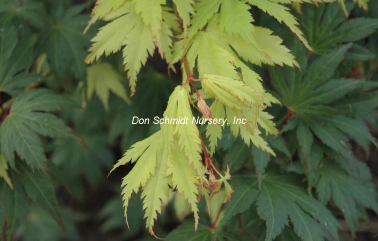 Acer japonicum 'Ki Hachijo'is an upright growing, small tree with very serrated leaves. Fall color on Acer japonicum 'Ki Hachijo' is a stunning blend of yellow, orange and red. Bark is green with white streaking and adds winter interest.