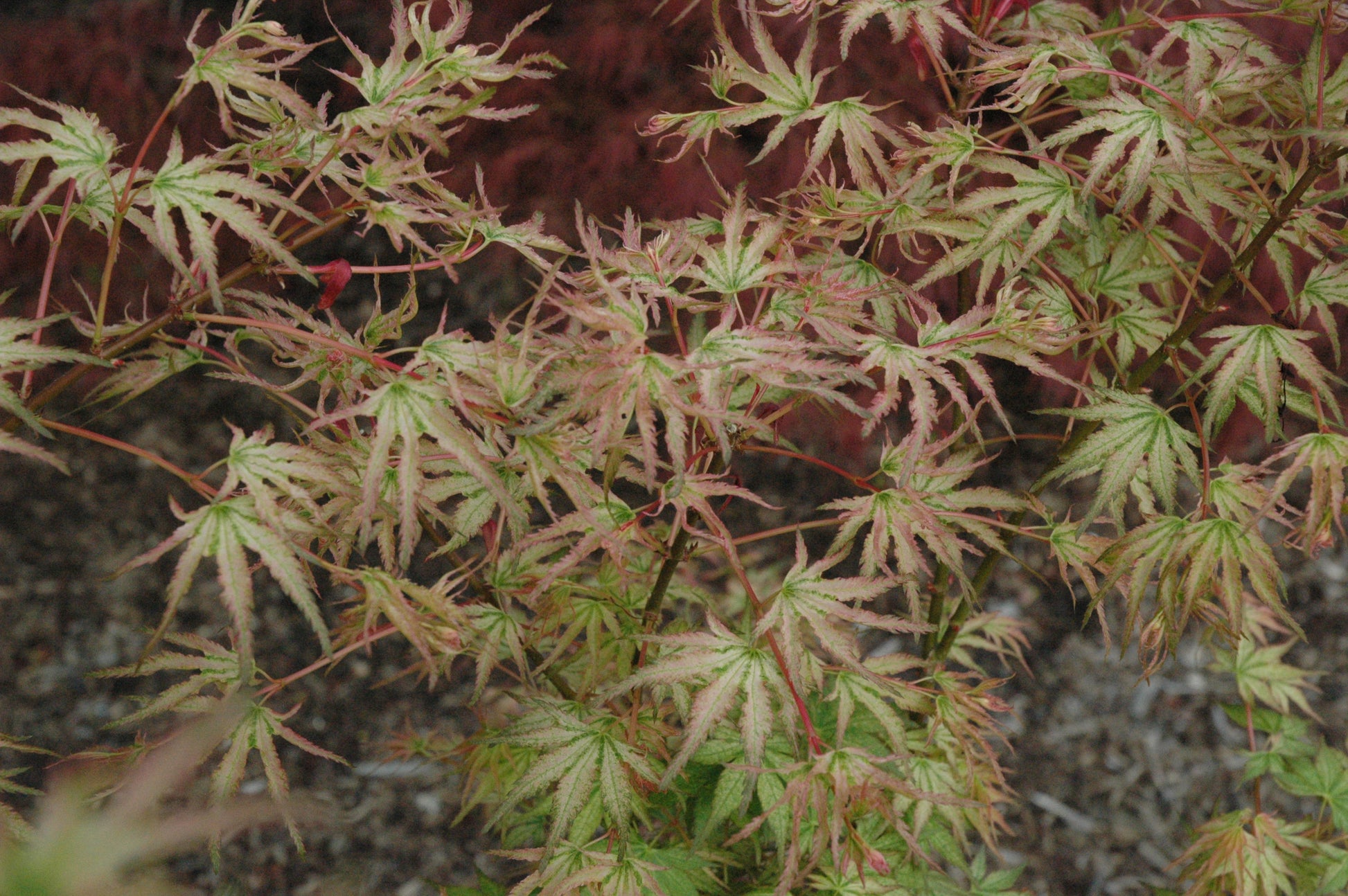 Acer palmatum 'Peve Multicolor'is a variegated Japanese maple with sandusting reticulation - the leaves are white with green veins and pink to purple edges. In summer the leaves darken to green but still show the sandusting pattern. Acer palmatum 'Peve Multicolor' is very much like 'Ukigumo' - some years the variegation is stunning, some years barely, if at all present. Suspect the color will be much better in the PNW but it can be stunning in warmer regions as well - just don't expect every year to be stunning.