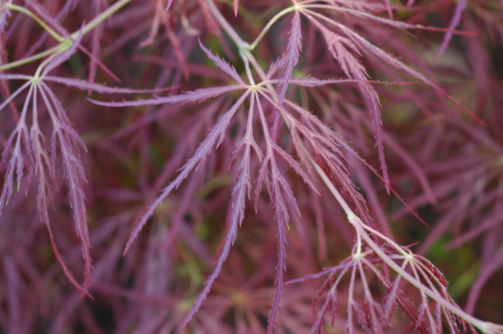 Acer palmatum 'Edgewood' is a weeping, cut leaf Japanese maple with mauve red spring growth that turn bronze in the summer and brilliant golden orange in the fall. Will come a stunning specimen in your garden.
