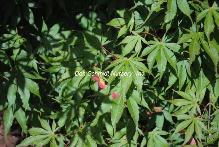 Acer palmatum 'Kurabu Yama' is a fast growing, green leave Japanese maple with spring leaves flushed purple then changing to deep green for the summer. Acer palmatum 'Kurabu Yama' has excellent fall color in tones of yellow, orange and red.