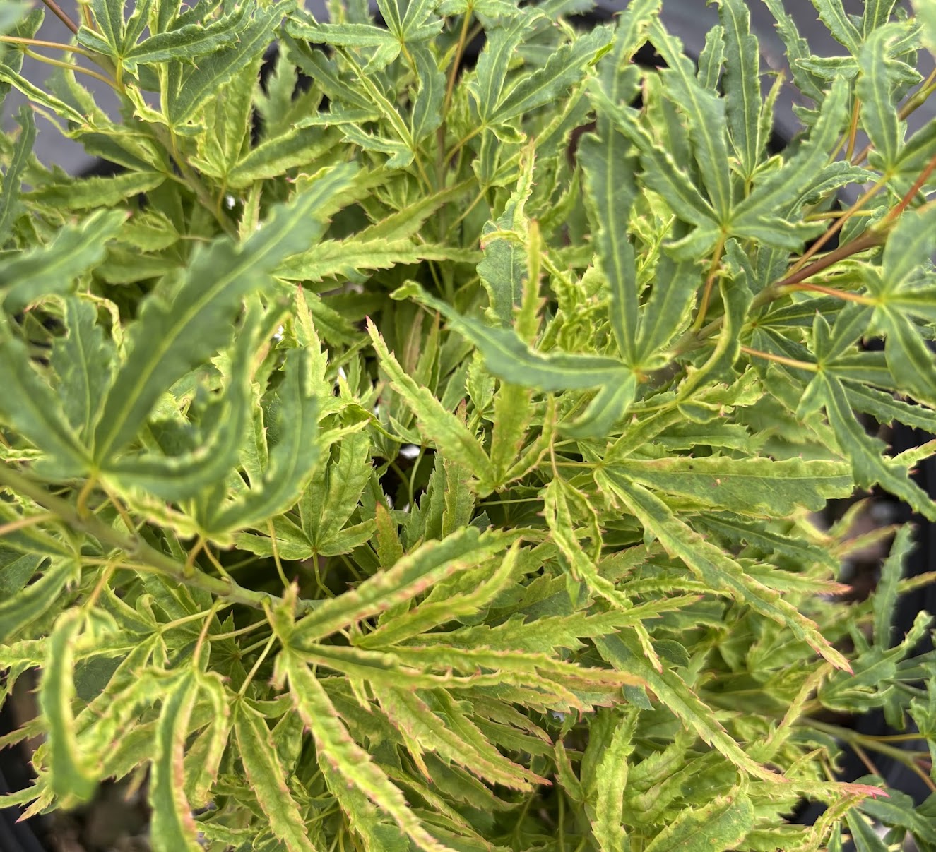 Acer palmatum 'Lily Pad' leaves emerge in the spring a bright lime green with a white variegation on the edge of the leaf. As the leaves mature they turn a darker green with the variegation holding steady through-out the entire season. The dense and dwarf growth habit of 'Lily Pad' make it great plant for those small confined spaces. Expect 'lily Pad' to reach 3ft high by 4ft wide in 10 years. If you needed one more reason to fall in love with Acer palmatum ' Lily Pad', the leaves are ruffled and are positioned around the stem in a whirled pattern. It just makes you wanted to love this little guy to pieces!
