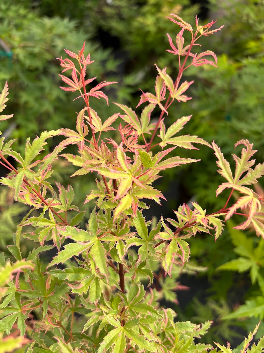 Acer palmatum 'Mama Fu' is a new face in the crowd, officially getting registered in 2012. 'Mama Fu' leaves emerge in the early spring bright pink. As the leaves expand you get a pink variegation laid over a bright lime green that is unlike any other Japanese maple. This gives 'Mama Fu' a stop in your tracks kind of attention in the garden. As the summer heat cranks up the pink variegation of 'Mama Fu' will fade to a clean cream color. As the fall temperatures start to dropped the leaves will turn orange to a brilliant red. Because of 'Mama Fu' relative new release, we can give you an educate guess that it should reach 10 to 12ft high in 15 years.