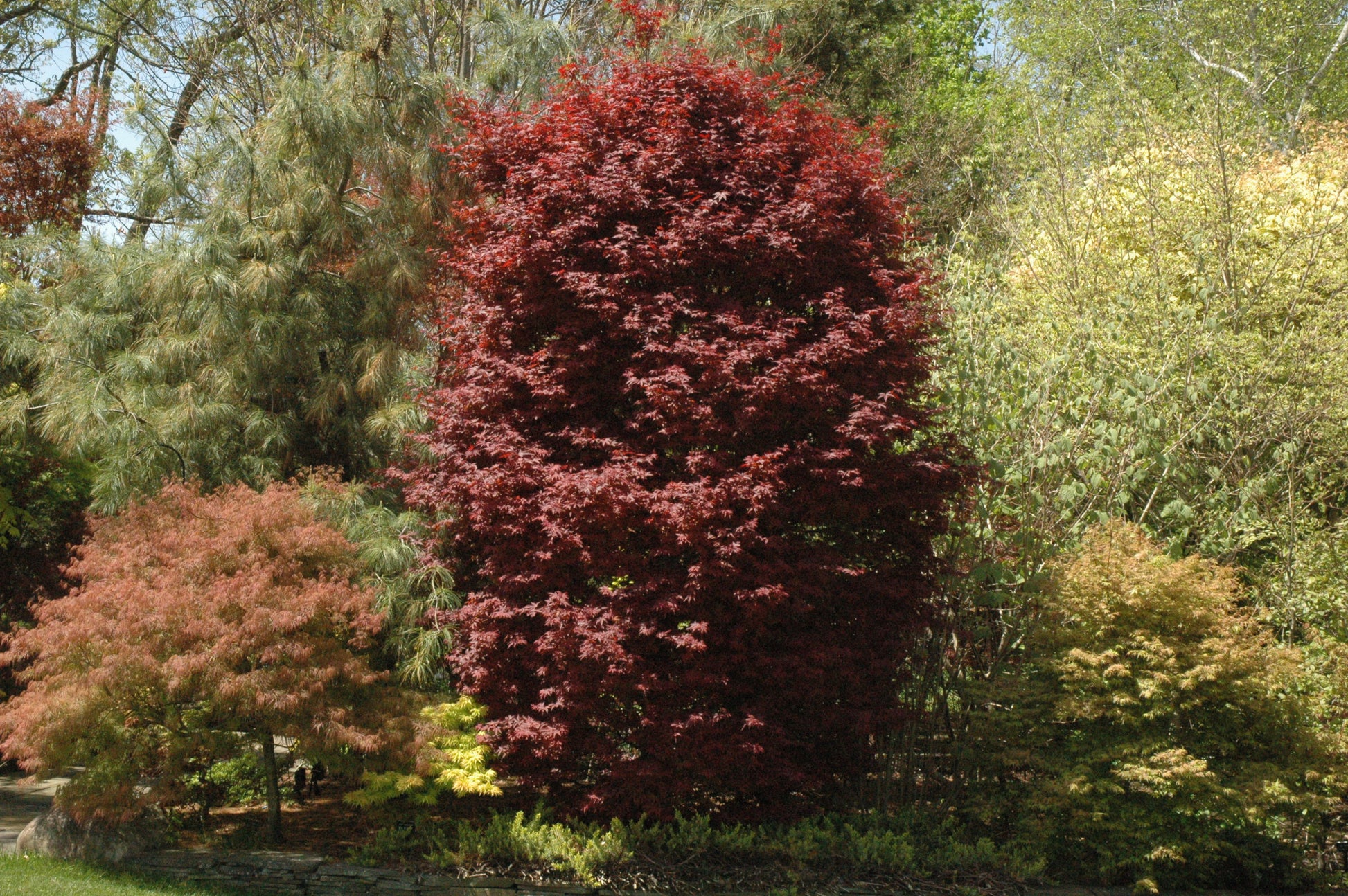 Acer palmatum 'Twombly's Red Sentinel' is an upright, red leaf Japanese maple with compact growth habit. Some websites show Acer palmatum 'Twombly's Red Sentinel' and an extremely narrow form - this is misleading and plants shown with that habit have been heavily pruned. Pictures below show realistic growth habit. An excellent choice for space needing a narrower growing plant.