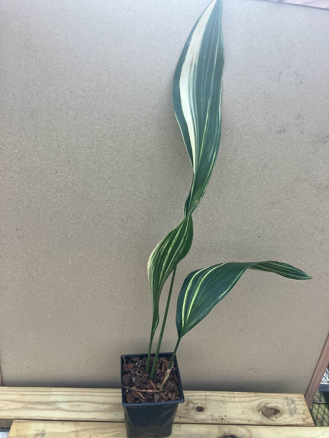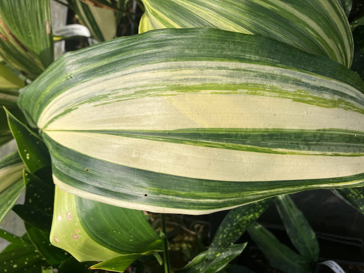 Aspidistra elatior 'Okame' is an evergreen groundcover with large green leaves with yellowish/white stripes. Aspidistra elatior 'Okame' is a stunning, large growing aspidistra that is great in shaded, well drained woodland gardens. Aspidistra elatior 'Okame' is fantastic as an accent plant or mass planting in a woodland garden. Aspidistra elatior 'Okame' makes a wonderful, bold statement in a woodland garden and especially beautiful when planted with ferns but is equally fantastic under Japanese maples or other woodland trees or large shrubs. Aspidistra elatior 'Okame' is beautiful in a container but must be moved inside during the winter in cold areas.