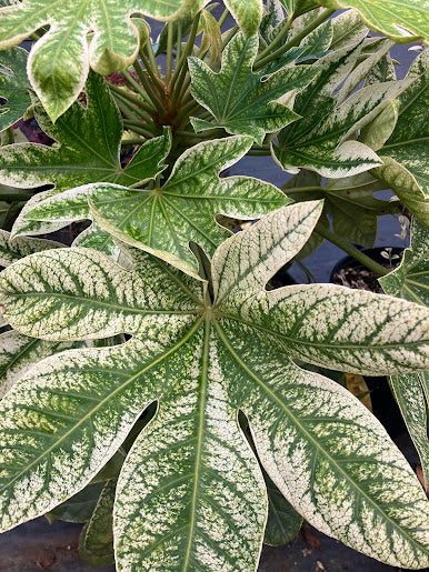 Fatsia japonica 'Spider's Web' (Japanese Aralia) is an evergreen shrub with large, palmate green leaves bordered with white speckling. Fatsia japonica 'Spider's Web' makes a stunning accent plant in a shady garden - as the plants mature, the variegation becomes more pronounced. Fatsia japonica 'Spider's Web' is a great companion plant for aucubas, camellias, ferns and more and is best planted with protection from extremes in weather. In colder climates, Fatsia japonica 'Spider's Web' can be used as a container plant and is well adapted to growing in a bright spot in your house. Fatsia japonica 'Spider's Web' is one of those WOW plants in your garden! Our plants are seed grown and will show slight variations in color, but all will have good "webbing".