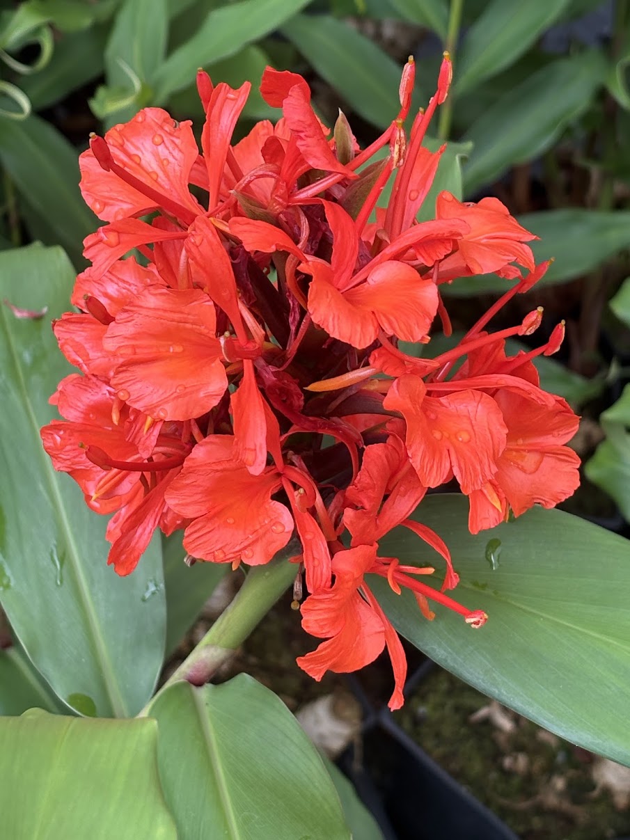 Hedychium deceptrum (Red Hardy Ginger Lily) is an uncommon ginger has dark burgundy bracts with brilliant orange-red flowers in mid to late summer and green leaves. My favorite ginger due to its stunning color and low stature. Hedychium deceptrum would be stunning in a large mass (it is a slowly running clump) or could be used as a specimen as well. This is one of the hardiest "red" flowered gingers. These are seed grown plants and we are seeing a little variation in growth habit and leaf color (we found an awesome dwarf and a bright gold leaf seedling - we will watch these, and if good enough, will offer in the future). Not expecting much color variation in the flowers, but we don't yet know. Probably best to keep inside a greenhouse or warm garage this winter and plant in the ground in Spring unless you live in a very mild winter climate area.