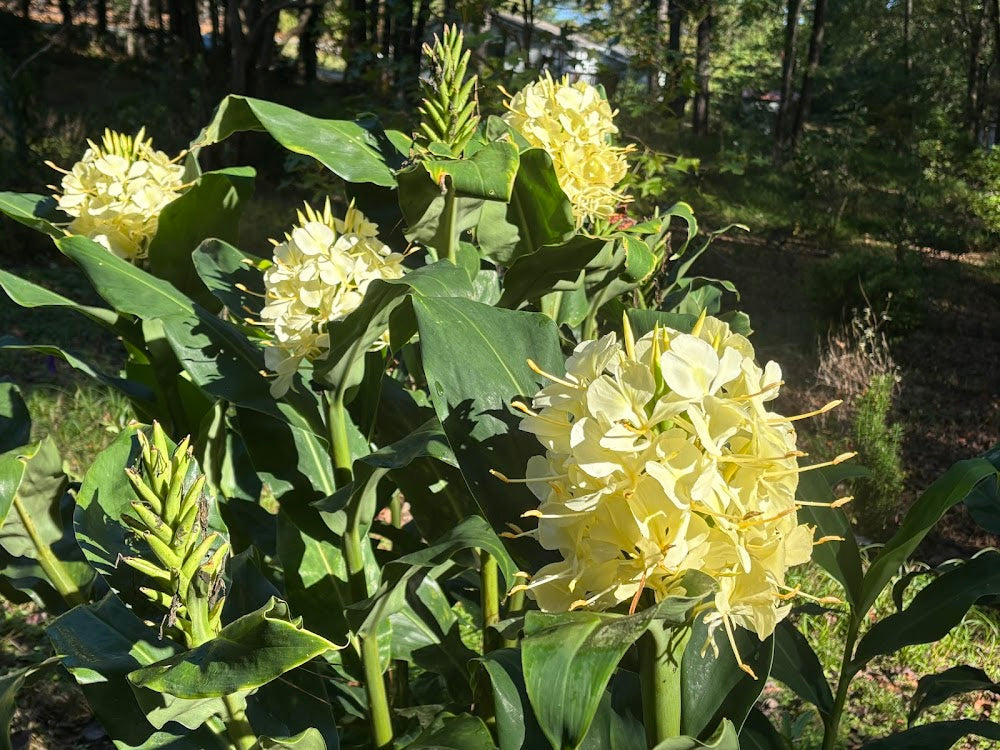 Hedychium garnerianum is a ginger with green leaves, pale yellow, fragrant flowers in Autumn. Hedychium garnerianum is one of my favorite gingers due to its late flowering (no other gingers in our garden bloom as late), very thick stems (it doesn't fall over like many other gingers), its stunning pale yellow, extremely fragrant flowers that open in mass on each stem and very dark green leaves. Truly a stunning addition to the garden Hedychium gardnerianum would be stunning in a large mass (it is a slowly running clump) or could be used as a specimen as well. These are seed grown plants and we are seeing a little variation in growth habit and leaf color Not expecting much color variation in the flowers, but we don't yet know. Probably best to keep inside a greenhouse or warm garage this winter and plant in the ground in the Spring unless you live in a very mild winter climate area.