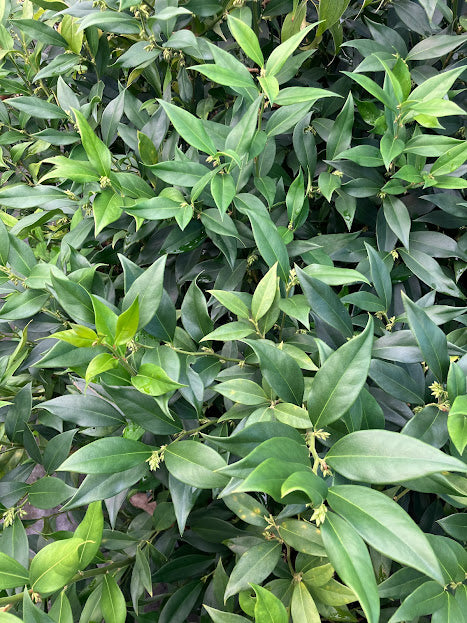 Sarcococca orientalis (Christmas box, oriental sarcococca, sweet box) is a broadleaf evergreen sub shrub with glossy evergreen leaves and small, extremely fragrant, white flowers in late winter. Sarcococca orientalis is one of our best winter flowering small shrubs/ tall groundcovers we grow. It blooms before Daphne odora and is extremely fragrant. The glossy, evergreen foliage of Sarcococca orientalis looks good year round and is great in most any shaded site. Sarcococca orientalis is fairly drought resistant once established but will not appreciate a wet site. Well drained soil is best. Sarcococca orientalis makes a wonderful mass planting when planted in drifts around a woodland garden, can be used as a foundation planting on the north side of your house, and works well with a wide range of other perennial and woody plants. The wonderful late winter fragrance of Sarcococca orientalis is reason enough to grow this wonderful landscape plant and with the addition of beautiful foliage, makes it a must have for garden plant.