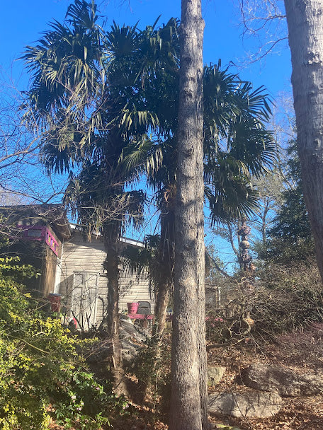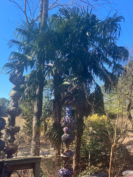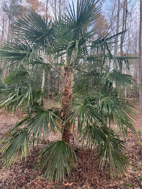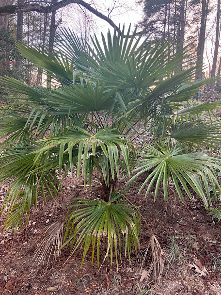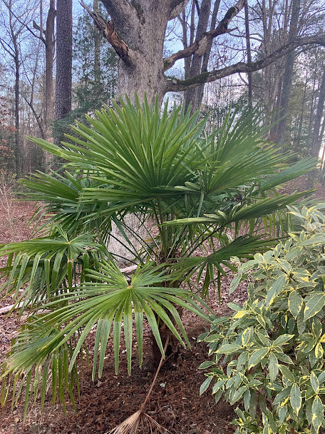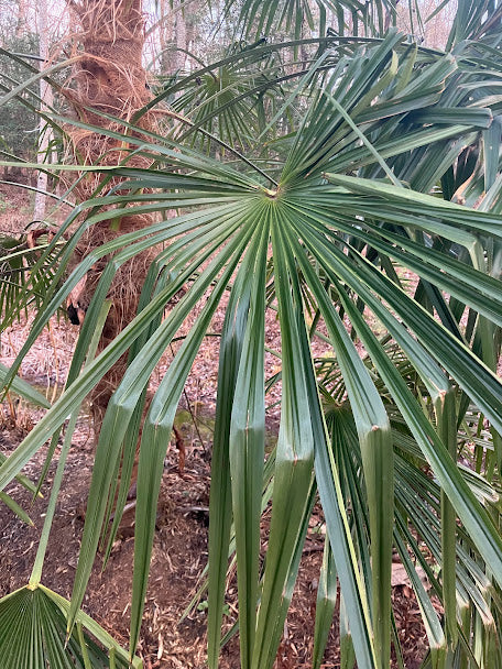 Trachycarpus fortunei "Taylor's" (windmill palm, Chinese windmill palm) is an evergreen tree with very large palmate leaves. Trachycarpus fortunei "Taylor's" is a seed strain of windmill palm that has demonstrated to be much more cold hardy than typical windmill palms. The original grandmother tree was undamaged by the -9 F degree cold that Raleigh, NC had during the mid 1980's. Trachycarpus fortunei "Taylor's" is slow growing for the first few years but once established, can put on tremendous yearly growth. My largest plant in the garden had 3-4' of trunk for several years, then put on 12' of additional trunk growth in a single year! Trachycarpus fortunei "Taylor's" does best in a slightly protected site to prevent damage to its huge bold leaves that add a sub-tropical or tropical feel to the garden. Trachycarpus fortunei "Taylor's" is among the more cold hardy trunking palms and grows best in fertile, moist, well-drained soil.